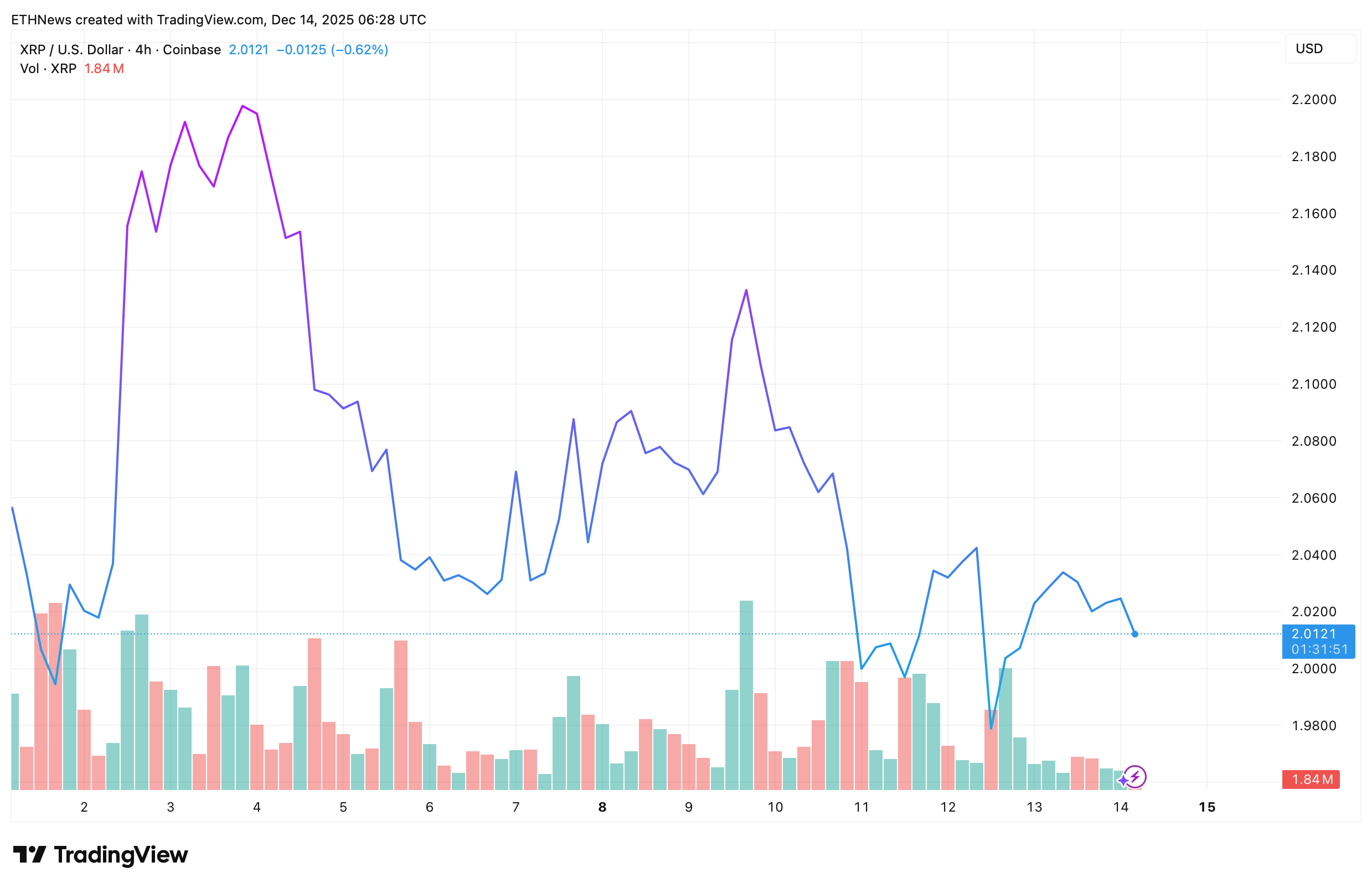 يُظهر الرسم البياني أن XRP يتذبذب بين $1.95 و$2.15 خلال الجلسات الأخيرة، دون حدوث انهيار حاسم. تبقى حركة التداول متقلبة، لكنها ما تزال ضمن حدود قناة تماسك أكبر.