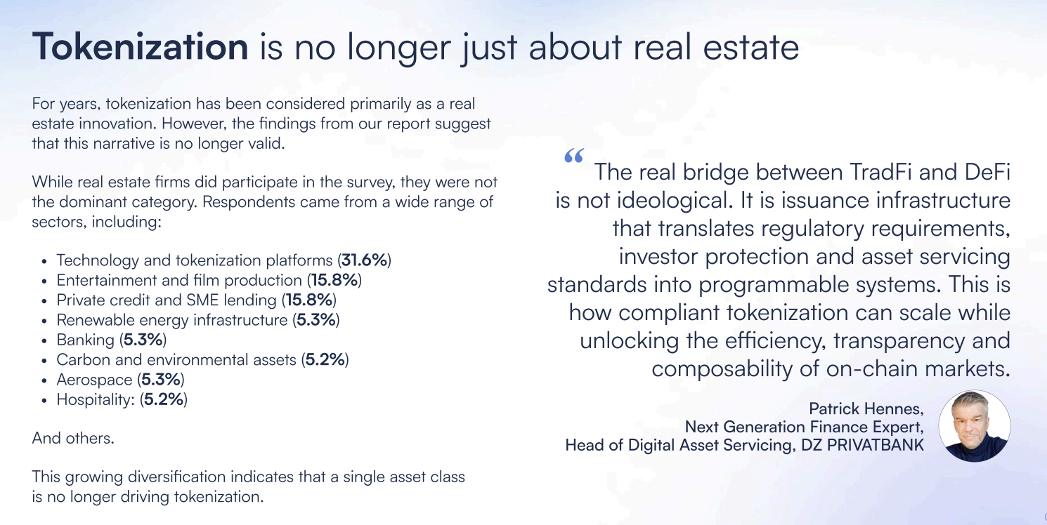 وبحسب النتائج، قال 53.8% من المجيبين إن السبب الرئيسي وراء توْكِنَة الأصول هو تحسين تكوين رأس المال وكفاءة جمع التمويل. في المقابل، ذكر 15.4% فقط السيولة باعتبارها دوافعهم الرئيسية.