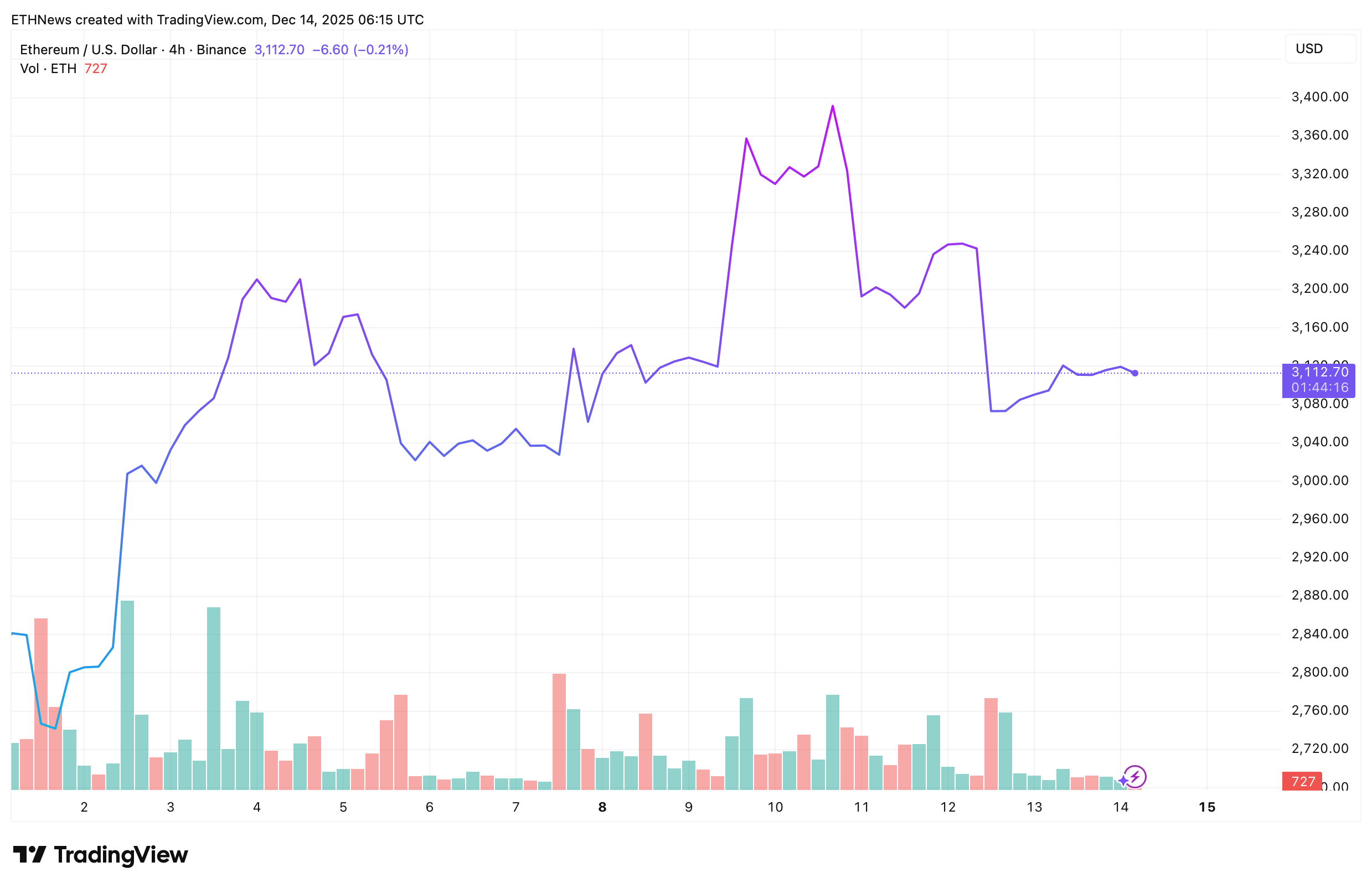 Le prix d’Ethereum a passé les derniers jours à se consolider autour de la zone des $3,100. Le graphique des prix sur 4 heures montre une série d’oscillations entre $3,250 et $3,050, suivies d’une phase de stabilisation où la volatilité s’est progressivement comprimée. Cette compression signale souvent que le marché se prépare à un mouvement directionnel.