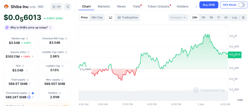 De acordo com a CoinMarketCap, Shiba Inu negocia perto de 0,000006 dólares a 1 de abril, mantendo-se acima das mínimas de fevereiro, enquanto o setor dos memes estabiliza.