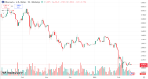 С середины января Ethereum находится в нисходящем тренде: за месяц он упал почти на 40% с $3,200. Текущая цена по-прежнему ниже своей 200-дневной экспоненциальной скользящей средней (EMA) на уровне $2,027, из-за чего общая картина технически остается медвежьей. Тем не менее рынок деривативов уже заново восстанавливает leverage.