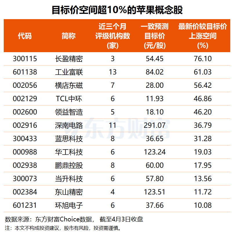 Về mức độ được tổ chức quan tâm, theo dữ liệu Eastmoney Choice, trong ba tháng gần đây có 14 cổ phiếu khái niệm Apple nhận được xếp hạng đầu tư từ 3 tổ chức trở lên; so với giá mục tiêu theo dự đoán nhất quán và giá đóng cửa mới nhất, có 7 cổ phiếu có dư địa tăng vượt 30%.