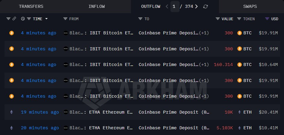 貝萊德 ETF 地址向 Coinbase 存入 1360 枚 BTC 和 15103 枚 ETH